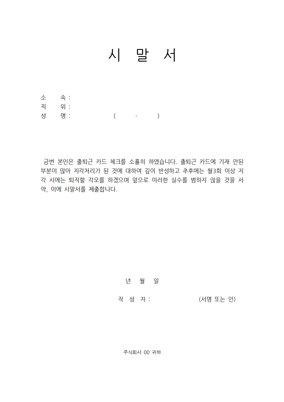지각 등 근태 관련 시말서 양식입니다.