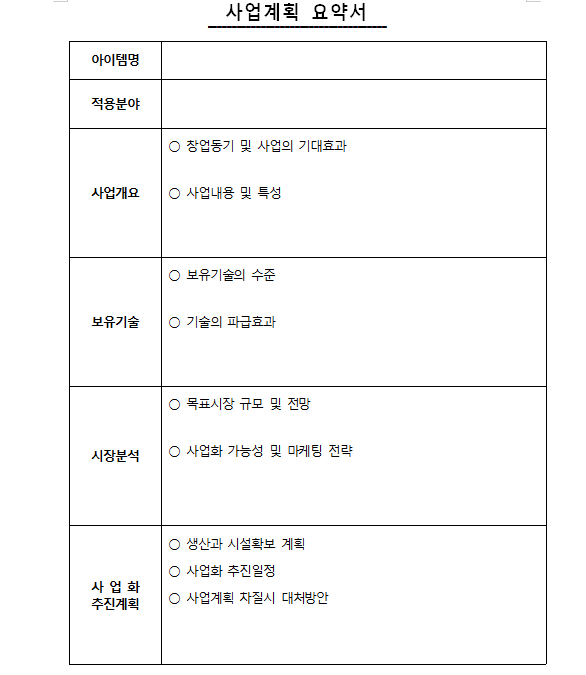 사업 계획 요약서 등의 목차로 구성되어 있으며 사업의 목적에 따라 수정이 가능합니다.