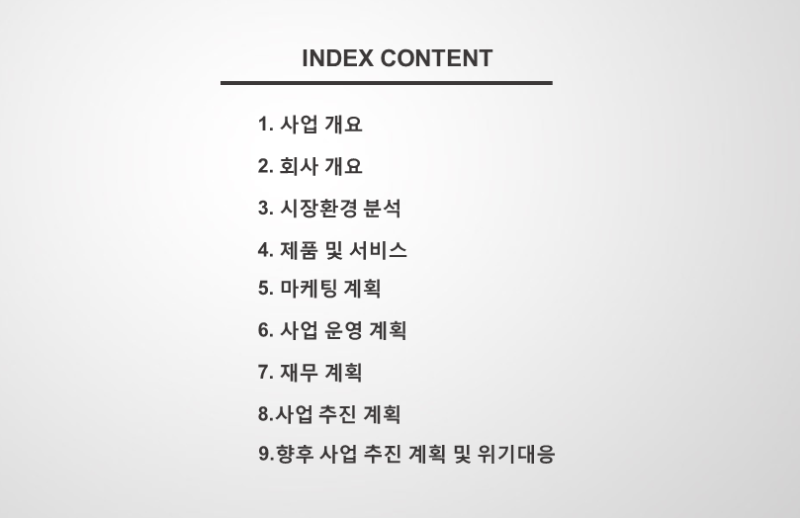 사업 개요, 회사 개요, 시장환경 분석, 제품 및 서빗, 마케팅 계획, 사업 운영 계획, 재무 계획, 사업 추진 계획, 향후 사업 추진 계획 및 위기 대응의 목차로 구성되어 있으며 사업의 목적에 따라 수정이 가능합니다.