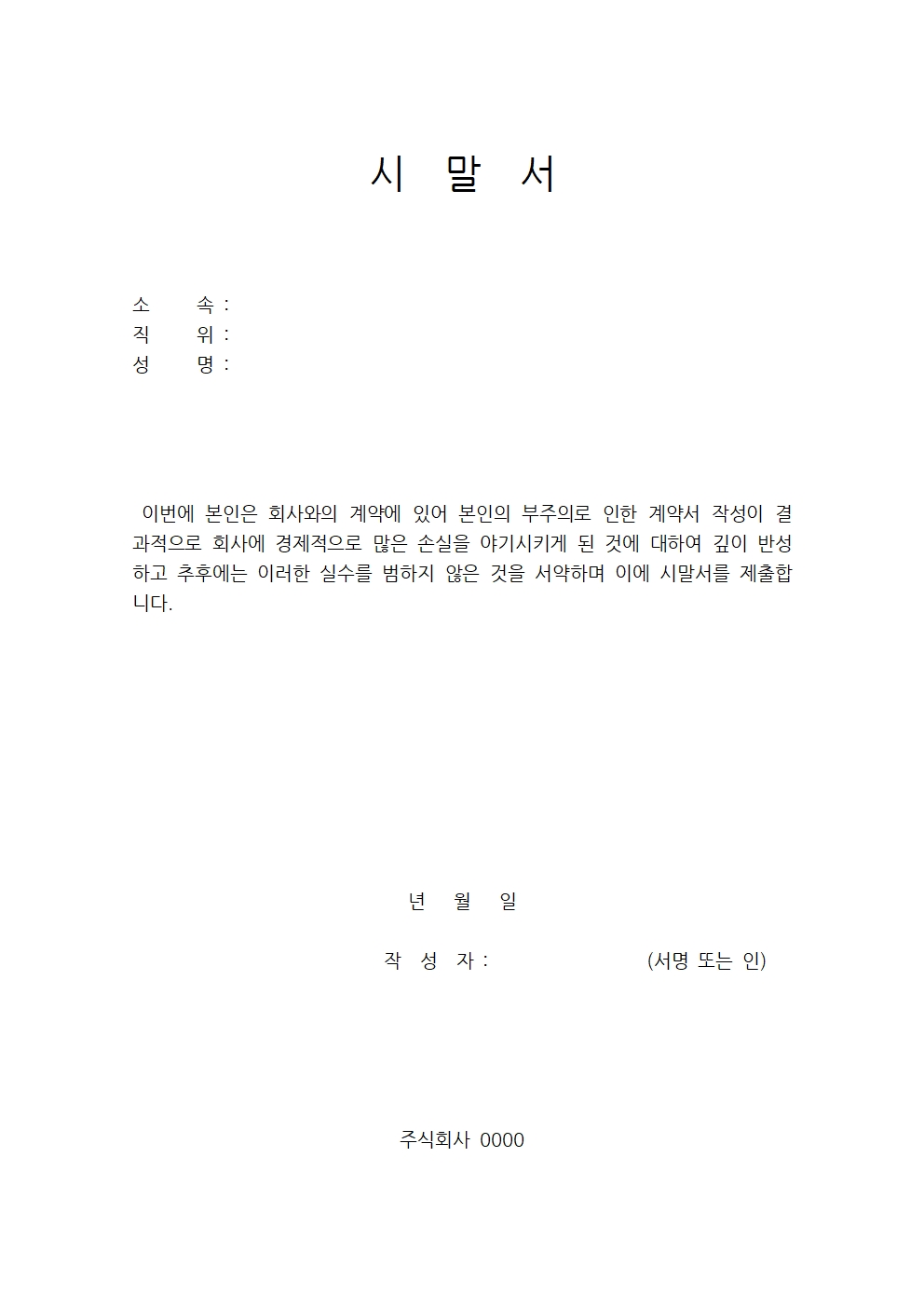 업무상 부주의, 과실 관련 시말서 양식입니다.